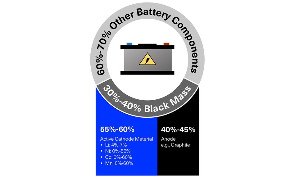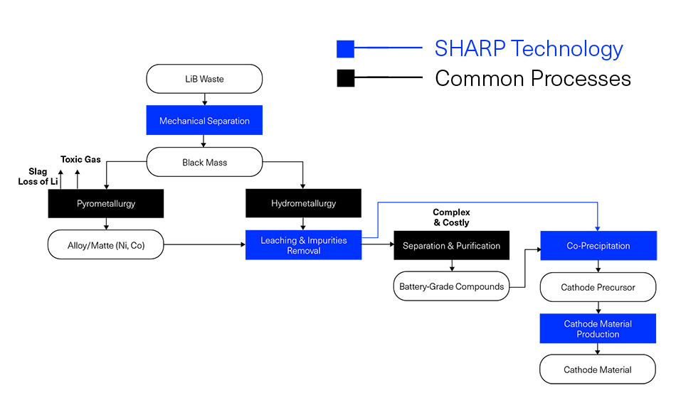 Höhere Effizienz Die Coherent Technologie SHARP (Streamlined Hydrometallurgical Advanced Recycling Process) gewinnt über 95 % des Li, Ni, Co und Mn aus der schwarzen Masse von LiBs zurück. |
