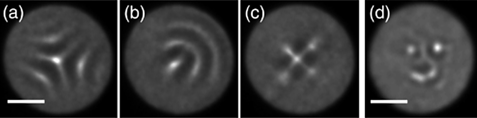 In the Juffmann setup, a beamsplitter picks off a few percent of the laser intensity. This is focused onto a metal tip to create a burst of electrons which are then accelerated as a collimated beam. The rest of the laser beam is patterned by a spatial light modular before it interacts with the electron beam in a counterpropagating arrangement. The figure illustrates the ability of this approach to create arbitrary electron beam shapes of virtually any geometry and detail: this shows an image of a phosphor screen irradiated by the electron beam that has been manipulated to create various patterns, including a “smiley face.”